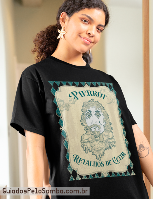 "Retalhos de Cetim" não é apenas uma música, é um sentimento. E essa camisa captura a essência dessa melodia atemporal, perfeita para quem aprecia a sofisticação do samba-canção e a figura romântica do Pierrô.
